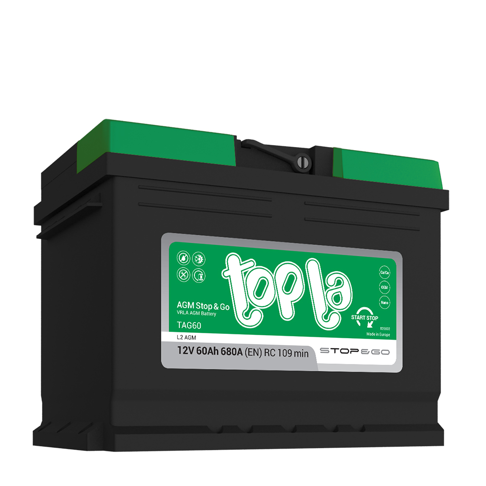 Topla Top AGM START & GO батериите се регулирани со вентил и оловна кисекина, наменети за возила со поголемо ниво на START & STOP функцијата со обновување на енергијата од прекин. VRLA AGM батеријата е подобрена батерија со оловна киселина до о своите максимални перформанси. Ќелиите на батеријата се затвораат со вентил за ослободување од притисок и електролитот е имобилизиран во апсорбирана стаглена подлога AGМ.